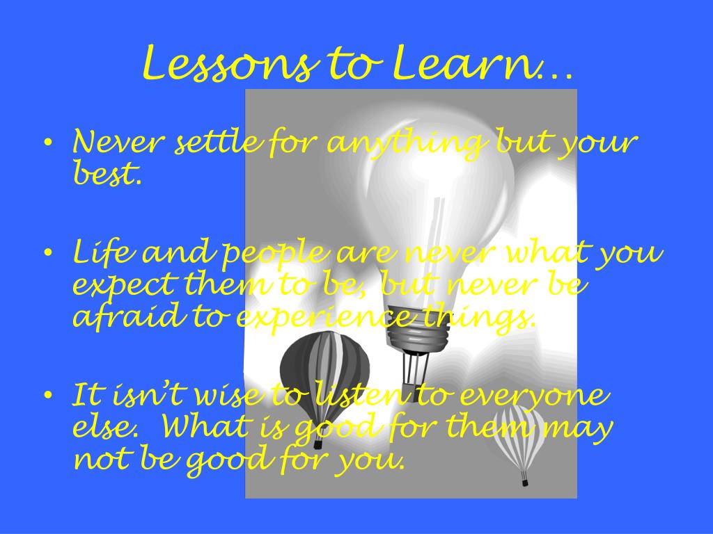 Lessons to Learn… • Never settle for anything but your best. • Life and people are never what you expect them to be, but never be afraid to experience things. • It isn’t wise to listen to everyone else. What is good for them may not be good for you.