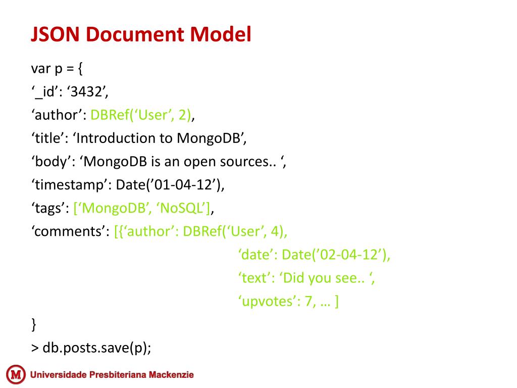 var p = { ‘_id’: ‘3432’, ‘author’: DBRef(‘User’, 2), ‘title’: ‘Introduction to MongoDB’, ‘body’: ‘MongoDB is an open sources.. ‘, ‘timestamp’: Date(’01-04-12’), ‘tags’: [‘MongoDB’, ‘NoSQL’], ‘comments’: [{‘author’: DBRef(‘User’, 4), ‘date’: Date(’02-04-12’), ‘text’: ‘Did you see.. ‘, ‘upvotes’: 7, … ] } > db.posts.save(p); JSON Document Model