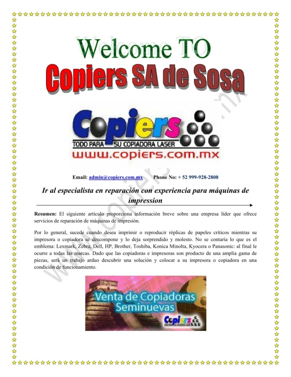Email: admin@copiers.com.mx Phone No: + 52 999-928-2808 Ir al especialista en reparación con experiencia para máquinas de impression Resumen: El siguiente artículo proporciona información breve sobre una empresa líder que ofrece servicios de reparación de máquinas de impresión. Por lo general, sucede cuando desea imprimir o reproducir réplicas de papeles críticos mientras su impresora o copiadora se descompone y lo deja sorprendido y molesto. No se contaría lo que es el emblema: Lexmark, Zebra, Dell, HP, Brother, Toshiba, Konica Minolta, Kyocera o Panasonic: al final le ocurre a todas las marcas. Dado que las copiadoras e impresoras son producto de una amplia gama de piezas, será un trabajo arduo descubrir una solución y colocar a su impresora o copiadora en una condición de funcionamiento.