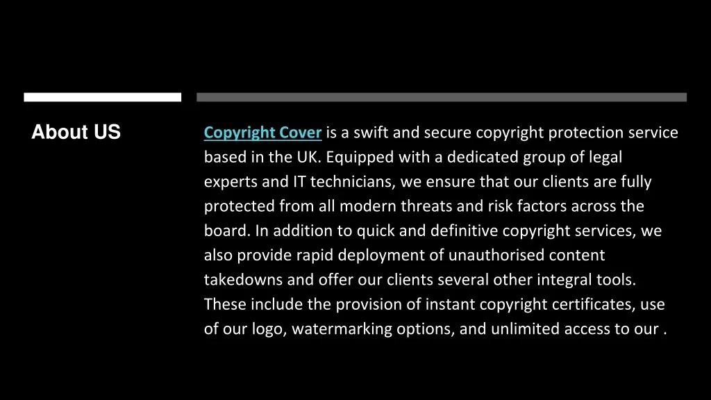 About US Copyright Cover is a swift and secure copyright protection service based in the UK. Equipped with a dedicated group of legal experts and IT technicians, we ensure that our clients are fully protected from all modern threats and risk factors across the board. In addition to quick and definitive copyright services, we also provide rapid deployment of unauthorised content takedowns and offer our clients several other integral tools. These include the provision of instant copyright certificates, use of our logo, watermarking options, and unlimited access to our .