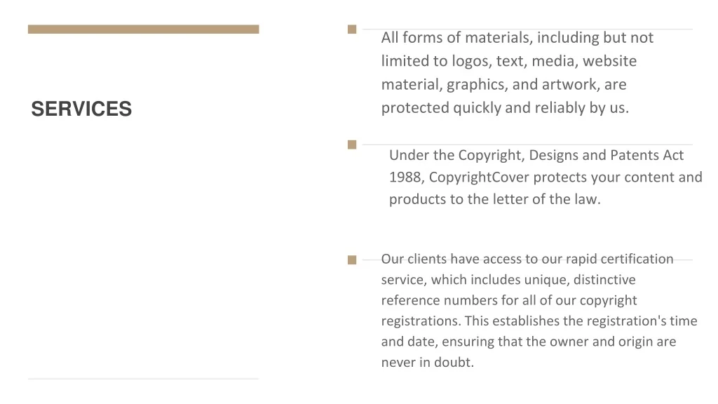 SERVICES All forms of materials, including but not limited to logos, text, media, website material, graphics, and artwork, are protected quickly and reliably by us. Under the Copyright, Designs and Patents Act 1988, CopyrightCover protects your content and products to the letter of the law. Our clients have access to our rapid certification service, which includes unique, distinctive reference numbers for all of our copyright registrations. This establishes the registration's time and date, ensuring that the owner and origin are never in doubt.