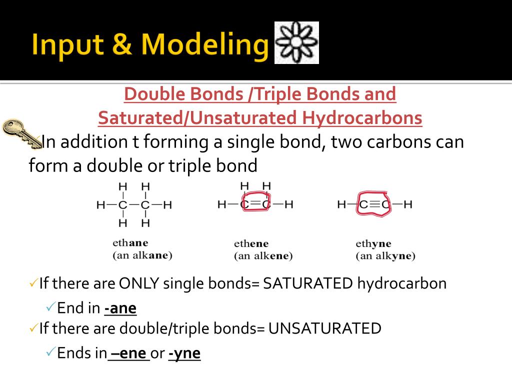 Input & Modeling Double Bonds /Triple Bonds and Saturated/Unsaturated Hydrocarbons • In addition t forming a single bond, two carbons can form a double or triple bond • If there are ONLY single bonds= SATURATED hydrocarbon • End in -ane • If there are double/triple bonds= UNSATURATED • Ends in –eneor -yne