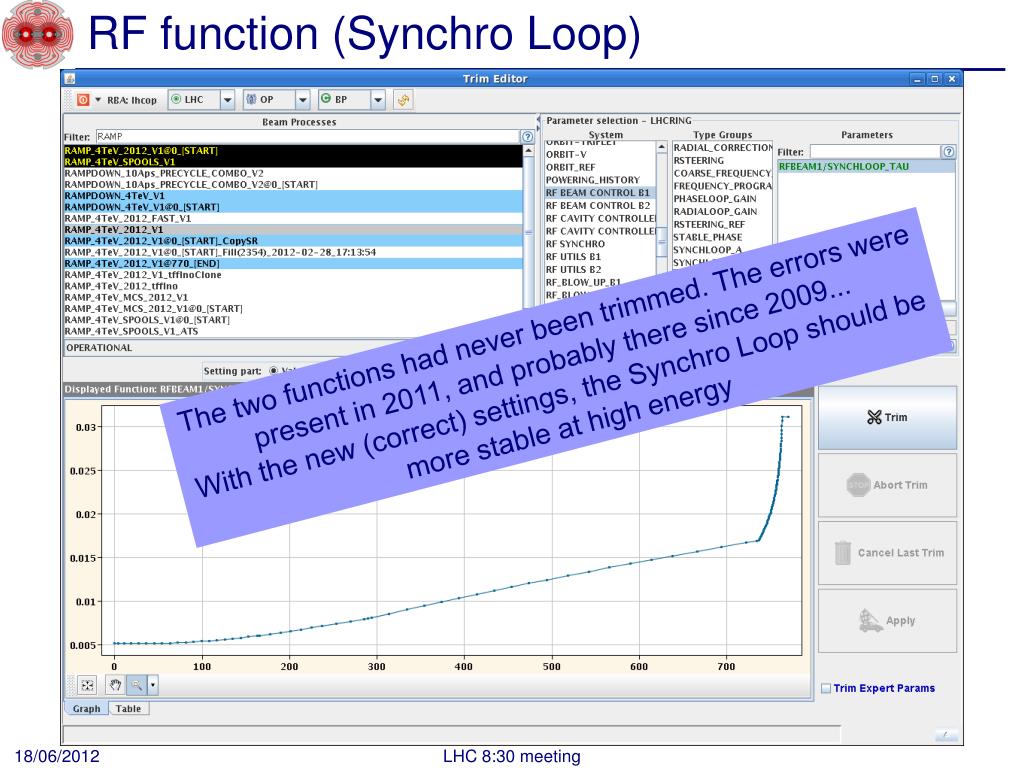 RF function (Synchro Loop) The two functions had never been trimmed. The errors were present in 2011, and probably there since 2009... With the new (correct) settings, the Synchro Loop should be more stable at high energy LHC 8:30 meeting