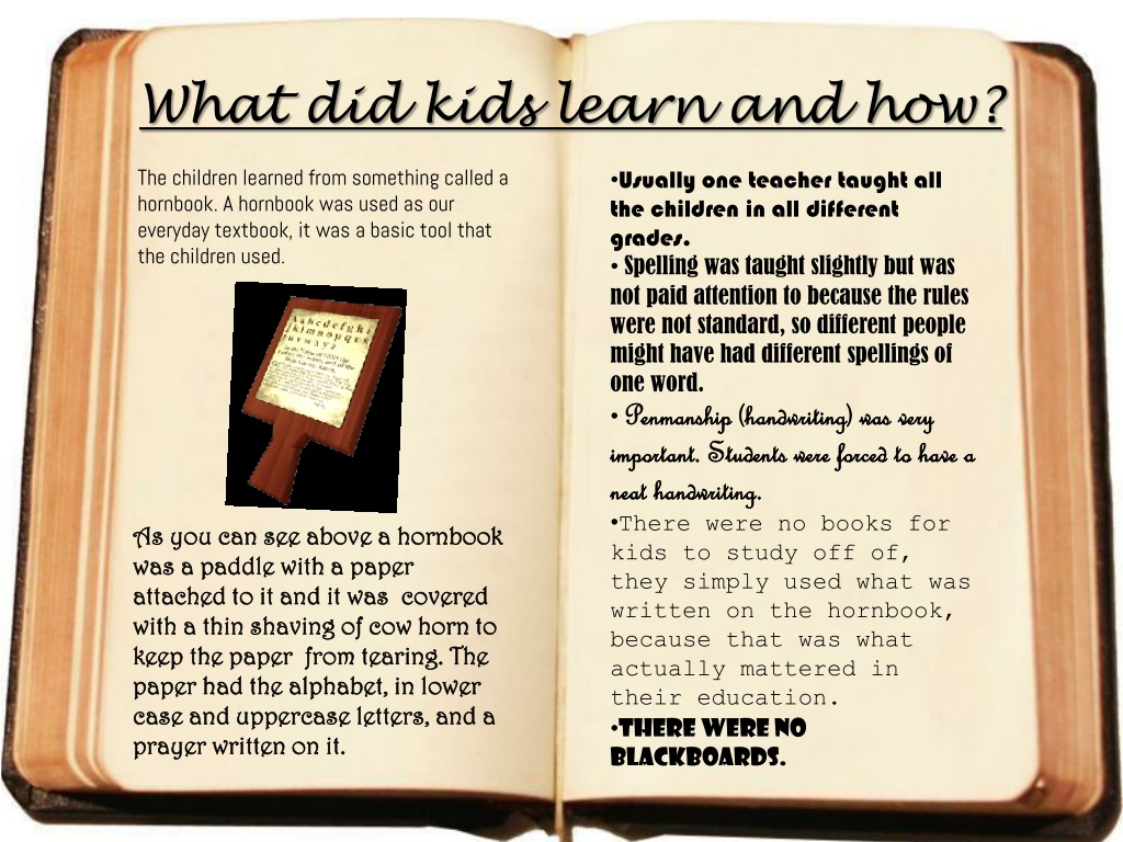 What did kids learn and how? • Usually one teacher taught all the children in all different grades. • Spelling was taught slightly but was not paid attention to because the rules were not standard, so different people might have had different spellings of one word. • Penmanship (handwriting) was very important. Students were forced to have a neat handwriting. • There were no books for kids to study off of, they simply used what was written on the hornbook, because that was what actually mattered in their education. • There were no blackboards. The children learned from something called a hornbook. A hornbook was used as our everyday textbook, it was a basic tool that the children used. As you can see above a hornbook was a paddle with a paper attached to it and it was covered with a thin shaving of cow horn to keep the paper from tearing. The paper had the alphabet, in lower case and uppercase letters, and a prayer written on it.