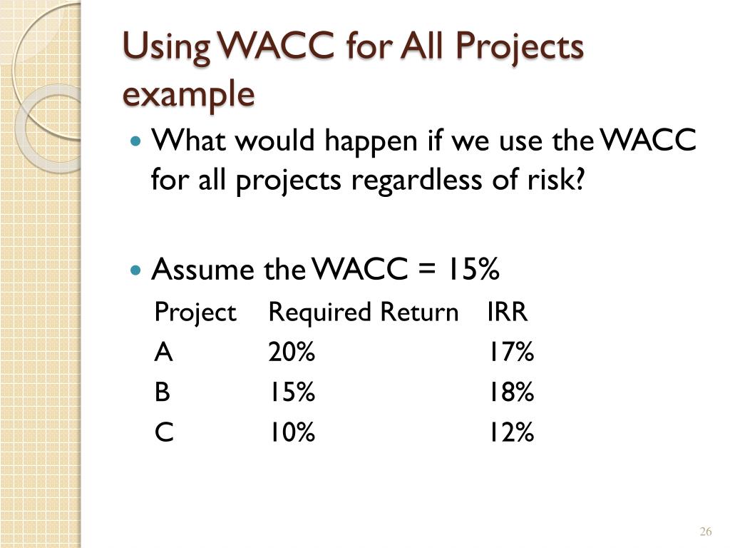 Using WACC for All Projects example • What would happen if we use the WACC for all projects regardless of risk? • Assume the WACC = 15% Project Required Return IRR A 20% 17% B 15% 18% C 10% 12%