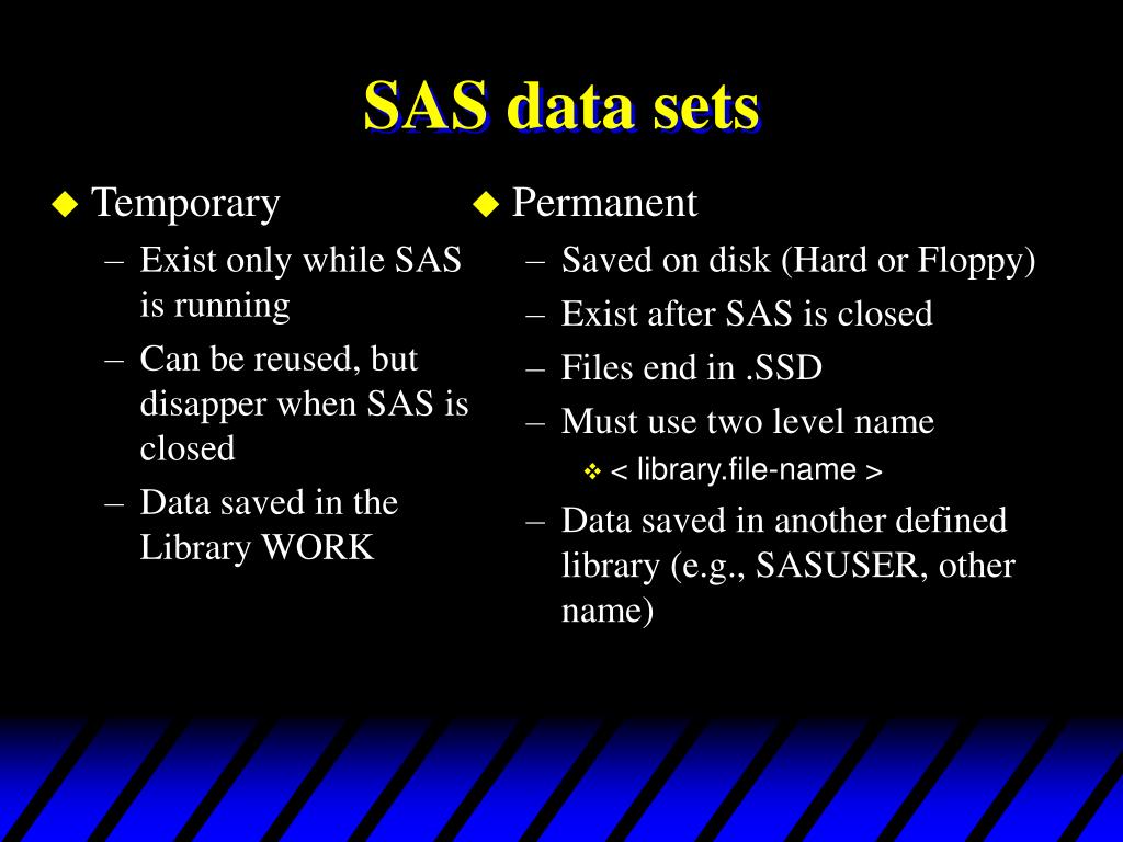 Temporary Exist only while SAS is running Can be reused, but disapper when SAS is closed Data saved in the Library WORK Permanent Saved on disk (Hard or Floppy) Exist after SAS is closed Files end in .SSD Must use two level name < library.file-name > Data saved in another defined library (e.g., SASUSER, other name) SAS data sets