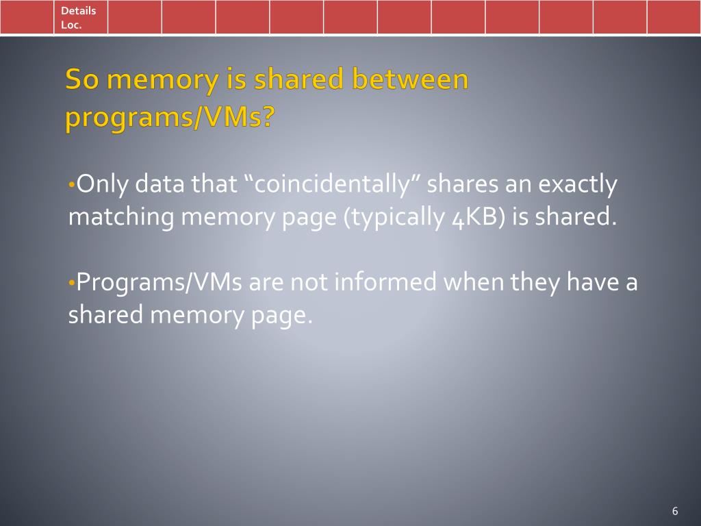 So memory is shared between programs/VMs? Only data that “coincidentally” shares an exactly matching memory page (typically 4KB) is shared. Programs/VMs are not informed when they have a shared memory page.
