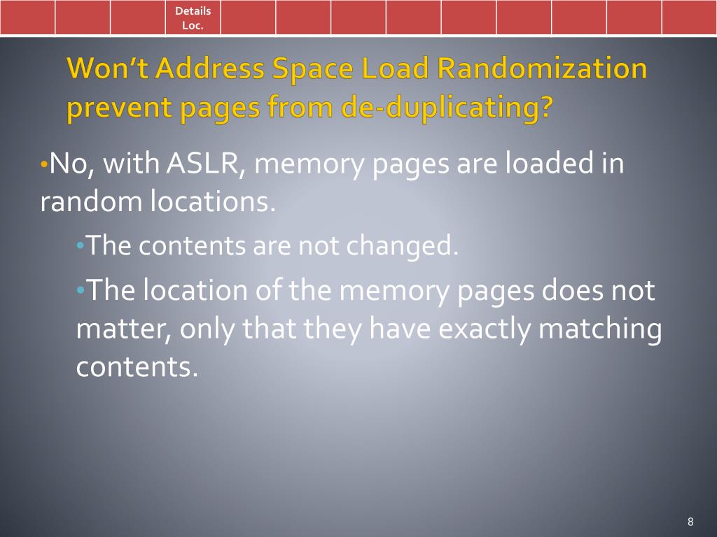 Won’t Address Space Load Randomization prevent pages from de-duplicating? No, with ASLR, memory pages are loaded in random locations. The contents are not changed. The location of the memory pages does not matter, only that they have exactly matching contents.