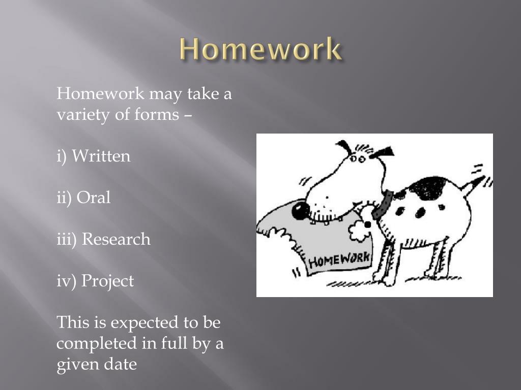 Homework Homework may take a variety of forms – i) Written ii) Oral iii) Research iv) Project This is expected to be completed in full by a given date