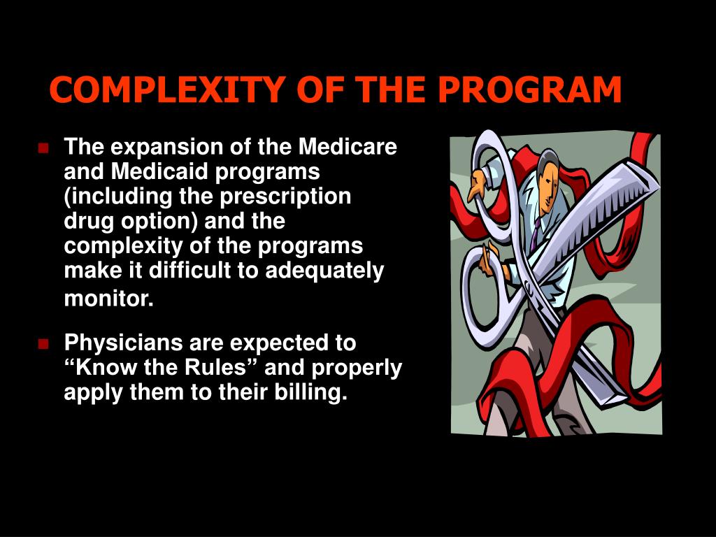 COMPLEXITY OF THE PROGRAM • The expansion of the Medicare and Medicaid programs (including the prescription drug option) and the complexity of the programs make it difficult to adequately monitor. • Physicians are expected to “Know the Rules” and properly apply them to their billing.