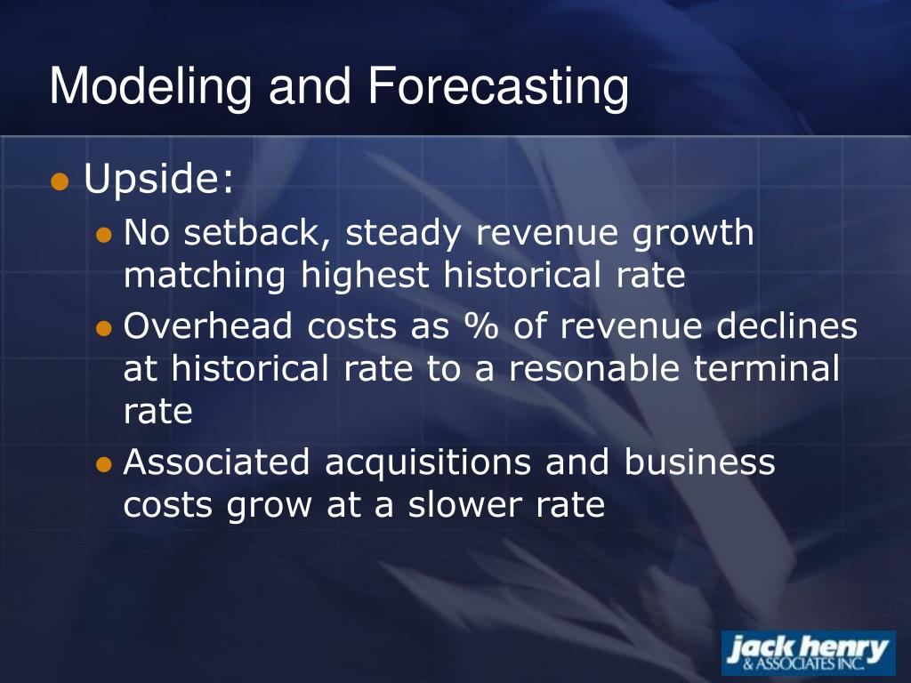 Modeling and Forecasting • Upside: • No setback, steady revenue growth matching highest historical rate • Overhead costs as % of revenue declines at historical rate to a resonable terminal rate • Associated acquisitions and business costs grow at a slower rate