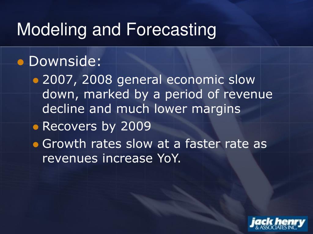 Modeling and Forecasting • Downside: • 2007, 2008 general economic slow down, marked by a period of revenue decline and much lower margins • Recovers by 2009 • Growth rates slow at a faster rate as revenues increase YoY.