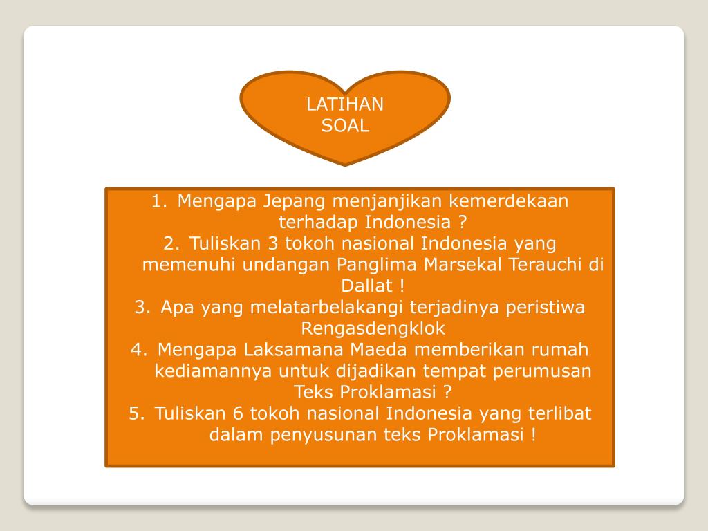 LATIHAN SOAL MengapaJepangmenjanjikankemerdekaanterhadap Indonesia ? Tuliskan 3 tokohnasional Indonesia yang memenuhiundanganPanglimaMarsekal Terauchi diDallat ! Apa yang melatarbelakangiterjadinyaperistiwaRengasdengklok MengapaLaksamana Maeda memberikanrumahkediamannyauntukdijadikantempatperumusanTeksProklamasi ? Tuliskan 6 tokohnasional Indonesia yang terlibatdalampenyusunanteksProklamasi !