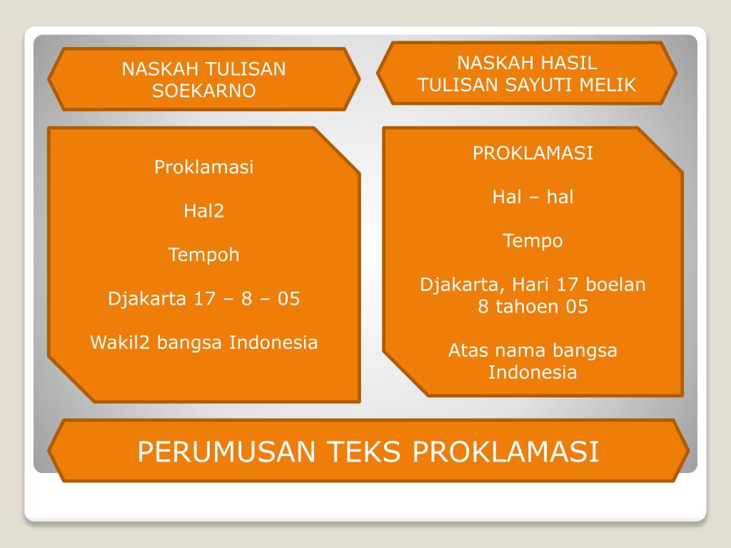 NASKAH HASIL TULISAN SAYUTI MELIK PERUMUSAN TEKS PROKLAMASI NASKAH TULISAN SOEKARNO Proklamasi Hal2 Tempoh Djakarta 17 – 8 – 05 Wakil2 bangsa Indonesia PROKLAMASI Hal – hal Tempo Djakarta, Hari 17 boelan 8 tahoen 05 Atasnamabangsa Indonesia PERUMUSAN TEKS PROKLAMASI