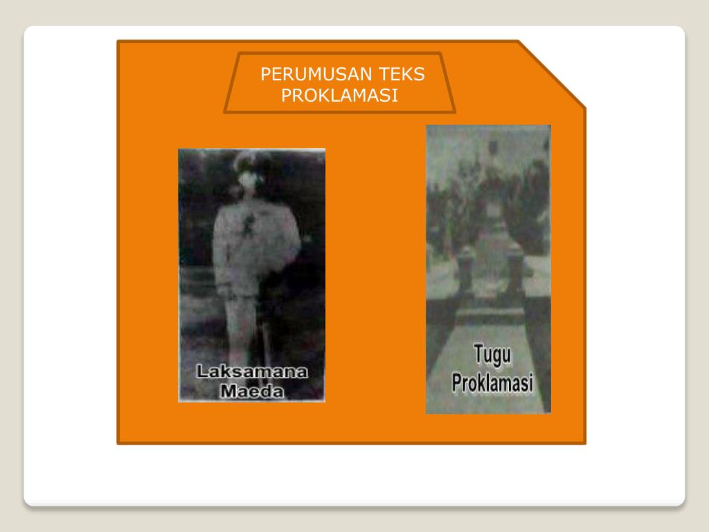 TOKOH YANG BERPERAN Pimpinanrapatdi lab. Utusanpemudautk Sukarno-Hatta KomandanKompi TokohGol. Tua Angk. LautJepangbersimpati pd perj. Bangsa Indonesia PerumusTeksProklamasi TokohMudamenyaksikan Per. TeksProklamasi PengetikNaskahProk. PengusulpenandatangananTeksProk. PembuatBendera PengibarBendera Proklamator KhaerulSaleh Darwin danWikana Sukarni,YusufKunto,Singgih CudancoSubeno Ahmad Subarjo Laksamana Maeda Soekarno, MohHatta Sukarni,SayutiMelik,Sudiro,BMDiah Sukarni SayutiMelik IbuFatmawati Suhud, Latif Sukarno - Hatta