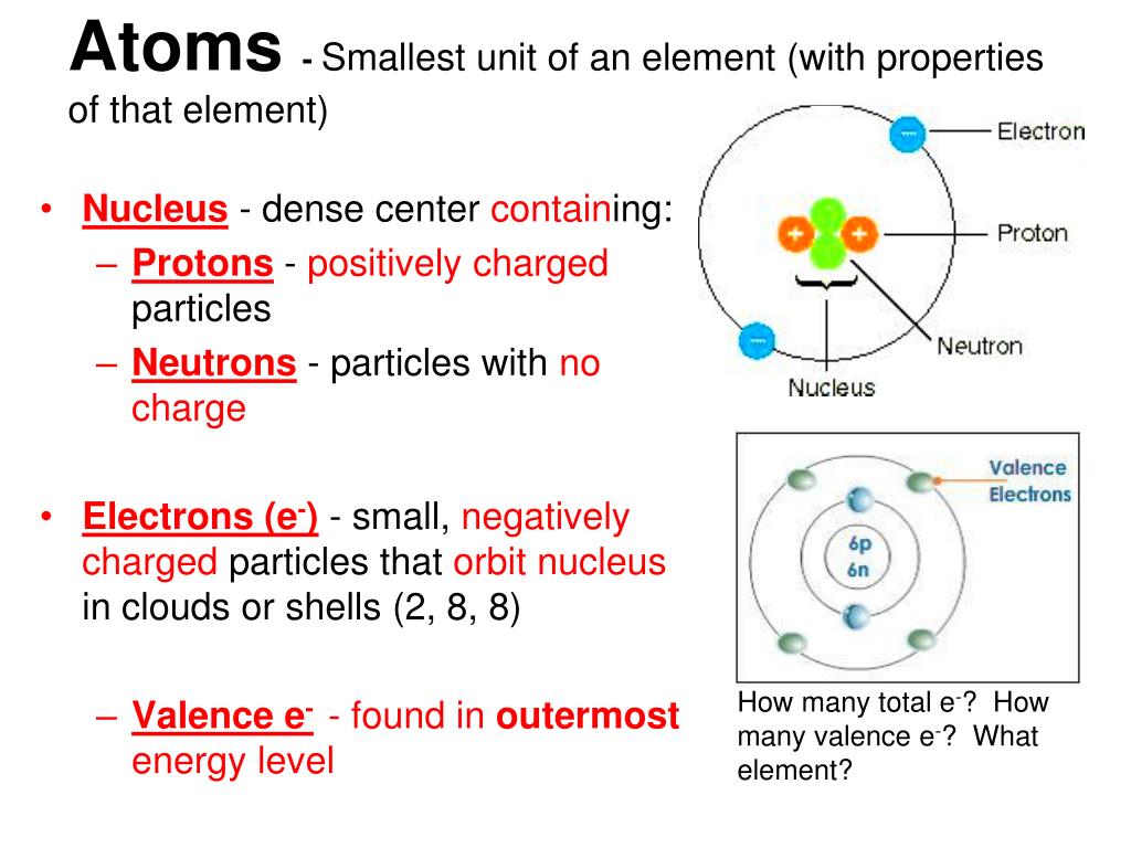Atoms - Smallest unit of an element (with properties of that element) • Nucleus-dense center containing: • Protons- positively charged particles • Neutrons- particles with no charge • Electrons (e-) - small, negatively charged particlesthat orbit nucleus in clouds or shells (2, 8, 8) • Valence e-- found in outermost energy level How many total e-? How many valence e-? What element?