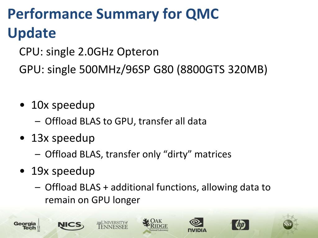Performance Summary for QMC Update CPU: single 2.0GHz Opteron GPU: single 500MHz/96SP G80 (8800GTS 320MB) • 10x speedup • Offload BLAS to GPU, transfer all data • 13x speedup • Offload BLAS, transfer only “dirty” matrices • 19x speedup • Offload BLAS + additional functions, allowing data to remain on GPU longer