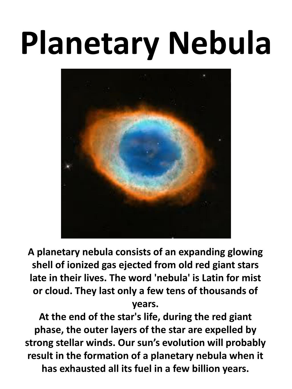 Planetary Nebula A planetary nebula consists of an expanding glowing shell of ionized gas ejected from old red giant stars late in their lives. The word 'nebula' is Latin for mist or cloud. They last only a few tens of thousands of years. At the end of the star's life, during the red giant phase, the outer layers of the star are expelled by strong stellar winds. Our sun’s evolution will probably result in the formation of a planetary nebula when it has exhausted all its fuel in a few billion years.