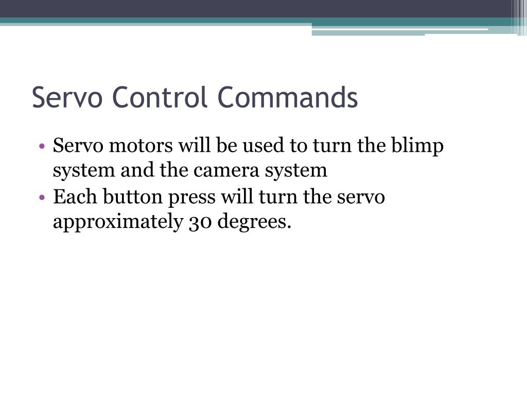 Servo Control Commands • Servo motors will be used to turn the blimp system and the camera system • Each button press will turn the servo approximately 30 degrees.