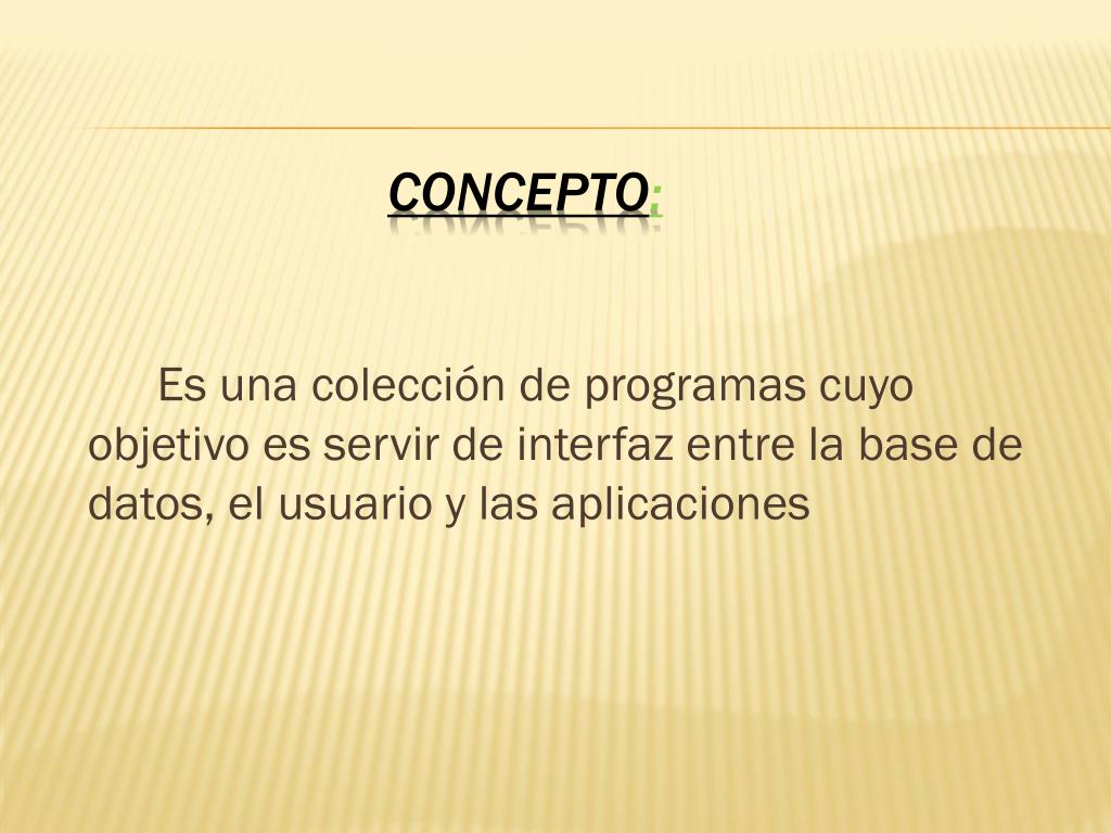 Es una colección de programas cuyo objetivo es servir de interfaz entre la base de datos, el usuario y las aplicaciones CONCEPTO: