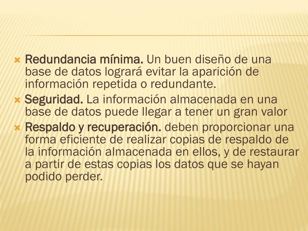 Redundancia mínima. Un buen diseño de una base de datos logrará evitar la aparición de información repetida o redundante. Seguridad. La información almacenada en una base de datos puede llegar a tener un gran valor Respaldo y recuperación. deben proporcionar una forma eficiente de realizar copias de respaldo de la información almacenada en ellos, y de restaurar a partir de estas copias los datos que se hayan podido perder.