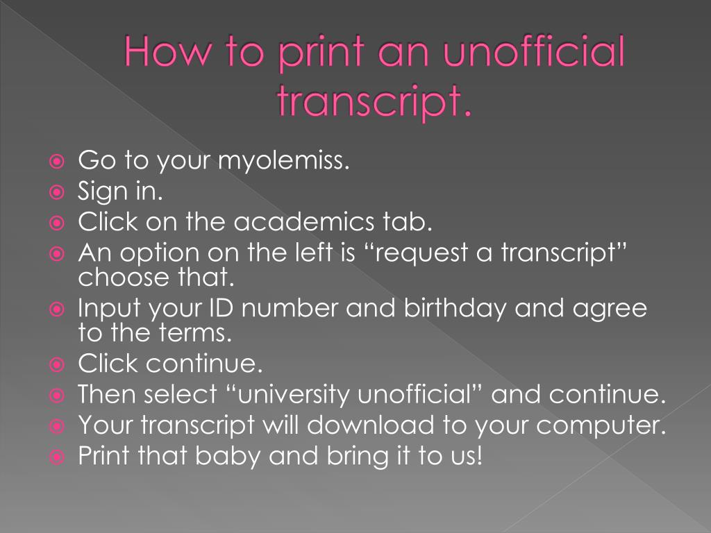 How to print an unofficial transcript. • Go to your myolemiss. • Sign in. • Click on the academics tab. • An option on the left is “request a transcript” choose that. • Input your ID number and birthday and agree to the terms. • Click continue. • Then select “university unofficial” and continue. • Your transcript will download to your computer. • Print that baby and bring it to us!