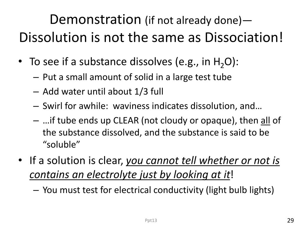 Demonstration (if not already done)—Dissolution is not the same as Dissociation! • To see if a substance dissolves (e.g., in H2O): • Put a small amount of solid in a large test tube • Add water until about 1/3 full • Swirl for awhile: waviness indicates dissolution, and… • …if tube ends up CLEAR (not cloudy or opaque), then all of the substance dissolved, and the substance is said to be “soluble” • If a solution is clear, you cannot tell whether or not is contains an electrolyte just by looking at it! • You must test for electrical conductivity (light bulb lights) Ppt13