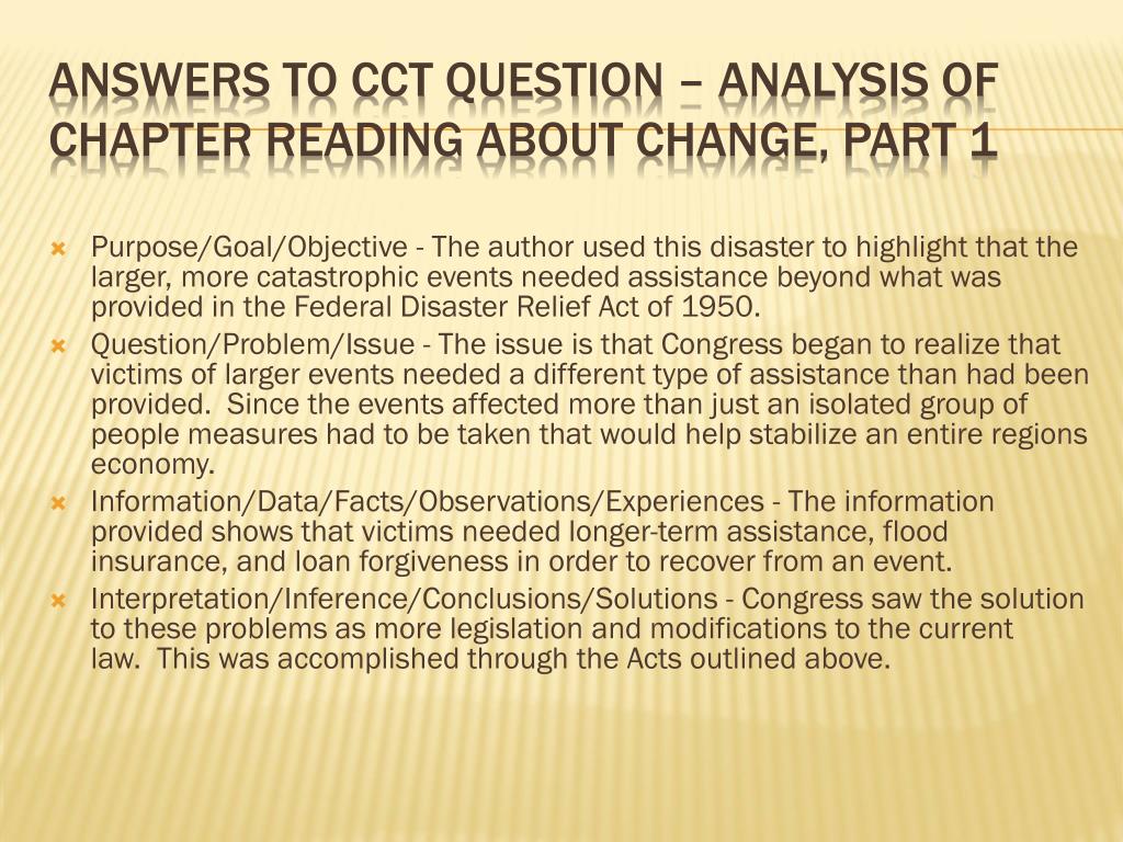 Purpose/Goal/Objective - The author used this disaster to highlight that the larger, more catastrophic events needed assistance beyond what was provided in the Federal Disaster Relief Act of 1950. Question/Problem/Issue - The issue is that Congress began to realize that victims of larger events needed a different type of assistance than had been provided. Since the events affected more than just an isolated group of people measures had to be taken that would help stabilize an entire regions economy. Information/Data/Facts/Observations/Experiences - The information provided shows that victims needed longer-term assistance, flood insurance, and loan forgiveness in order to recover from an event. Interpretation/Inference/Conclusions/Solutions - Congress saw the solution to these problems as more legislation and modifications to the current law. This was accomplished through the Acts outlined above. ANSWERS TO CCT QUESTION – ANALYSIS OF CHAPTER READING ABOUT CHANGE, PART 1