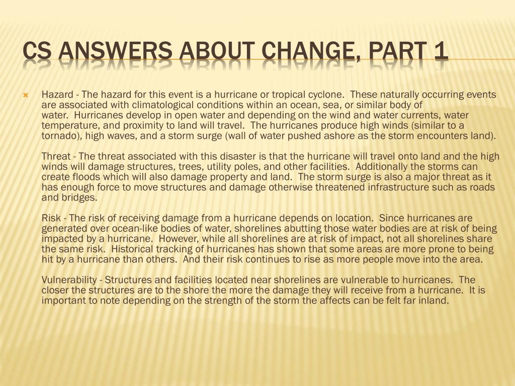 Hazard - The hazard for this event is a hurricane or tropical cyclone. These naturally occurring events are associated with climatological conditions within an ocean, sea, or similar body of water. Hurricanes develop in open water and depending on the wind and water currents, water temperature, and proximity to land will travel. The hurricanes produce high winds (similar to a tornado), high waves, and a storm surge (wall of water pushed ashore as the storm encounters land).Threat - The threat associated with this disaster is that the hurricane will travel onto land and the high winds will damage structures, trees, utility poles, and other facilities. Additionally the storms can create floods which will also damage property and land. The storm surge is also a major threat as it has enough force to move structures and damage otherwise threatened infrastructure such as roads and bridges.Risk - The risk of receiving damage from a hurricane depends on location. Since hurricanes are generated over ocean-like bodies of water, shorelines abutting those water bodies are at risk of being impacted by a hurricane. However, while all shorelines are at risk of impact, not all shorelines share the same risk. Historical tracking of hurricanes has shown that some areas are more prone to being hit by a hurricane than others. And their risk continues to rise as more people move into the area.Vulnerability - Structures and facilities located near shorelines are vulnerable to hurricanes. The closer the structures are to the shore the more the damage they will receive from a hurricane. It is important to note depending on the strength of the storm the affects can be felt far inland. CS ANSWERS ABOUT CHANGE, PART 1