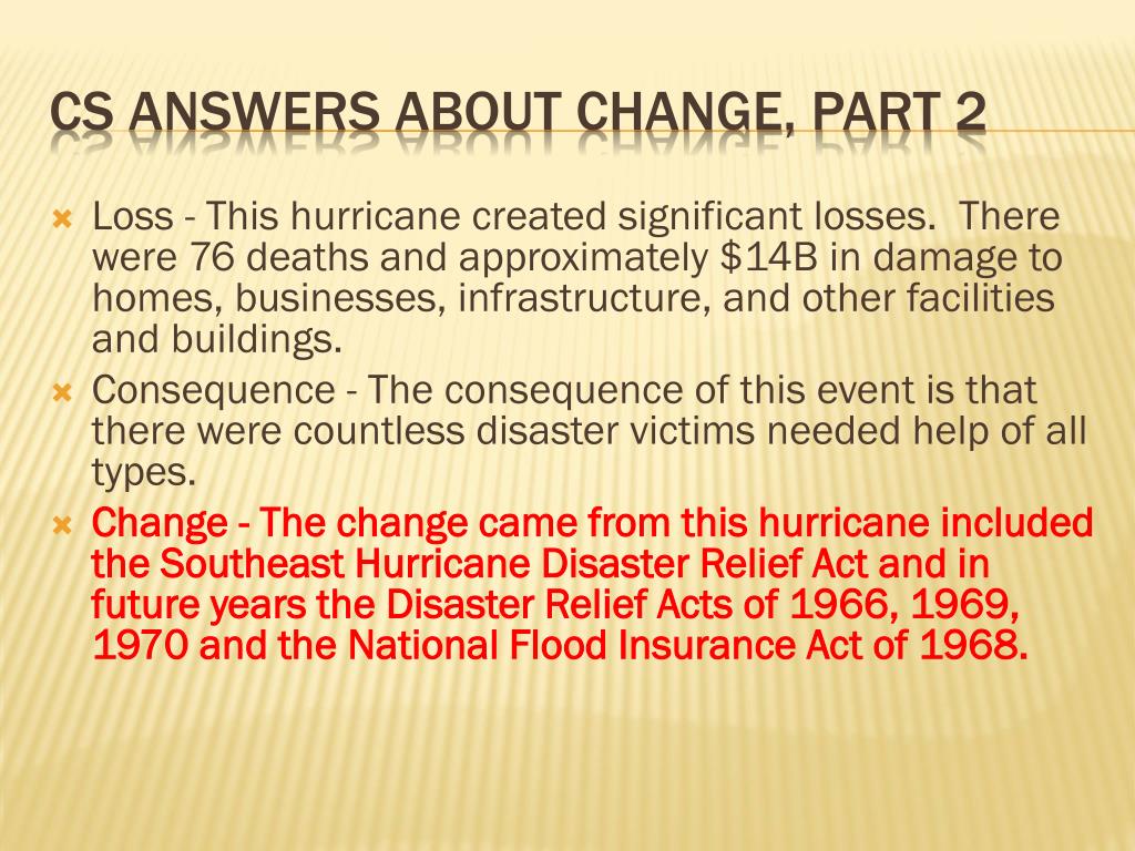 Loss - This hurricane created significant losses. There were 76 deaths and approximately $14B in damage to homes, businesses, infrastructure, and other facilities and buildings. Consequence - The consequence of this event is that there were countless disaster victims needed help of all types. Change - The change came from this hurricane included the Southeast Hurricane Disaster Relief Act and in future years the Disaster Relief Acts of 1966, 1969, 1970 and the National Flood Insurance Act of 1968. CS ANSWERS ABOUT CHANGE, PART 2