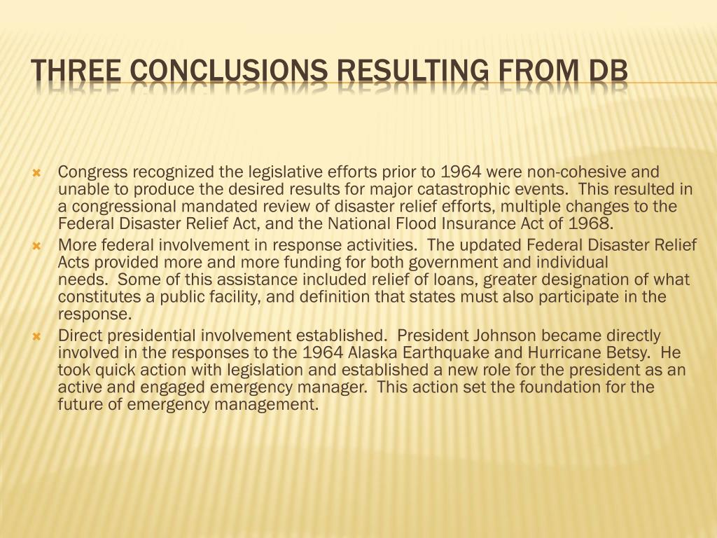 Congress recognized the legislative efforts prior to 1964 were non-cohesive and unable to produce the desired results for major catastrophic events. This resulted in a congressional mandated review of disaster relief efforts, multiple changes to the Federal Disaster Relief Act, and the National Flood Insurance Act of 1968. More federal involvement in response activities. The updated Federal Disaster Relief Acts provided more and more funding for both government and individual needs. Some of this assistance included relief of loans, greater designation of what constitutes a public facility, and definition that states must also participate in the response. Direct presidential involvement established. President Johnson became directly involved in the responses to the 1964 Alaska Earthquake and Hurricane Betsy. He took quick action with legislation and established a new role for the president as an active and engaged emergency manager. This action set the foundation for the future of emergency management. THREE CONCLUSIONS RESULTING FROM DB