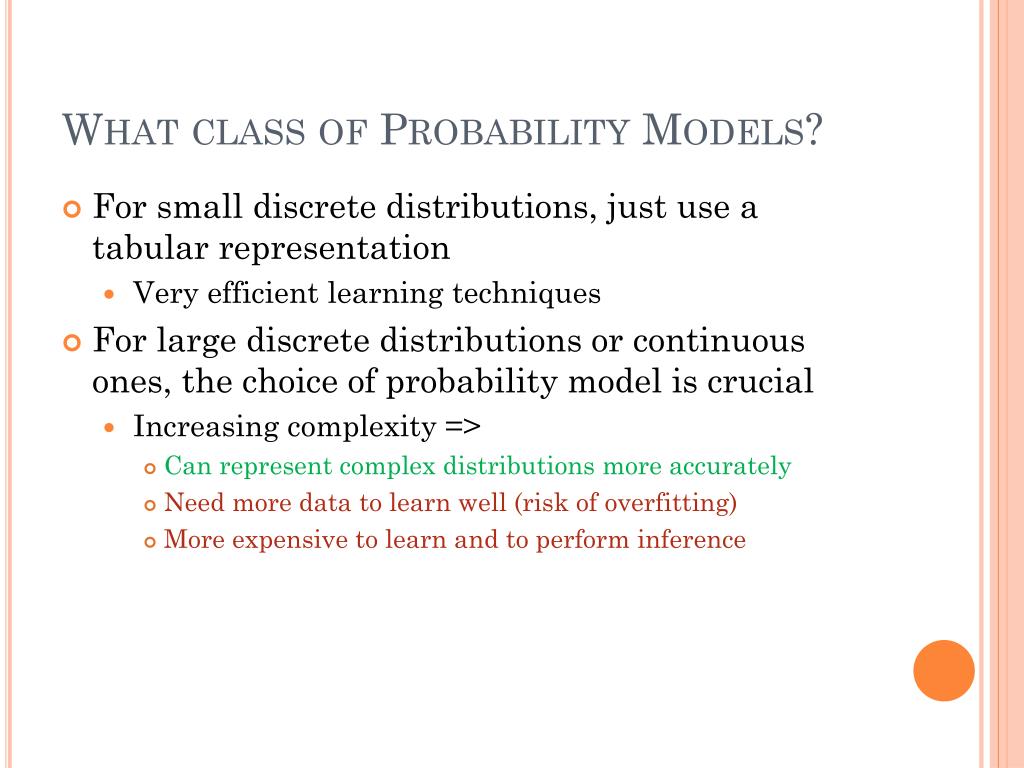 What class of Probability Models? • For small discrete distributions, just use a tabular representation • Very efficient learning techniques • For large discrete distributions or continuous ones, the choice of probability model is crucial • Increasing complexity => • Can represent complex distributions more accurately • Need more data to learn well (risk of overfitting) • More expensive to learn and to perform inference