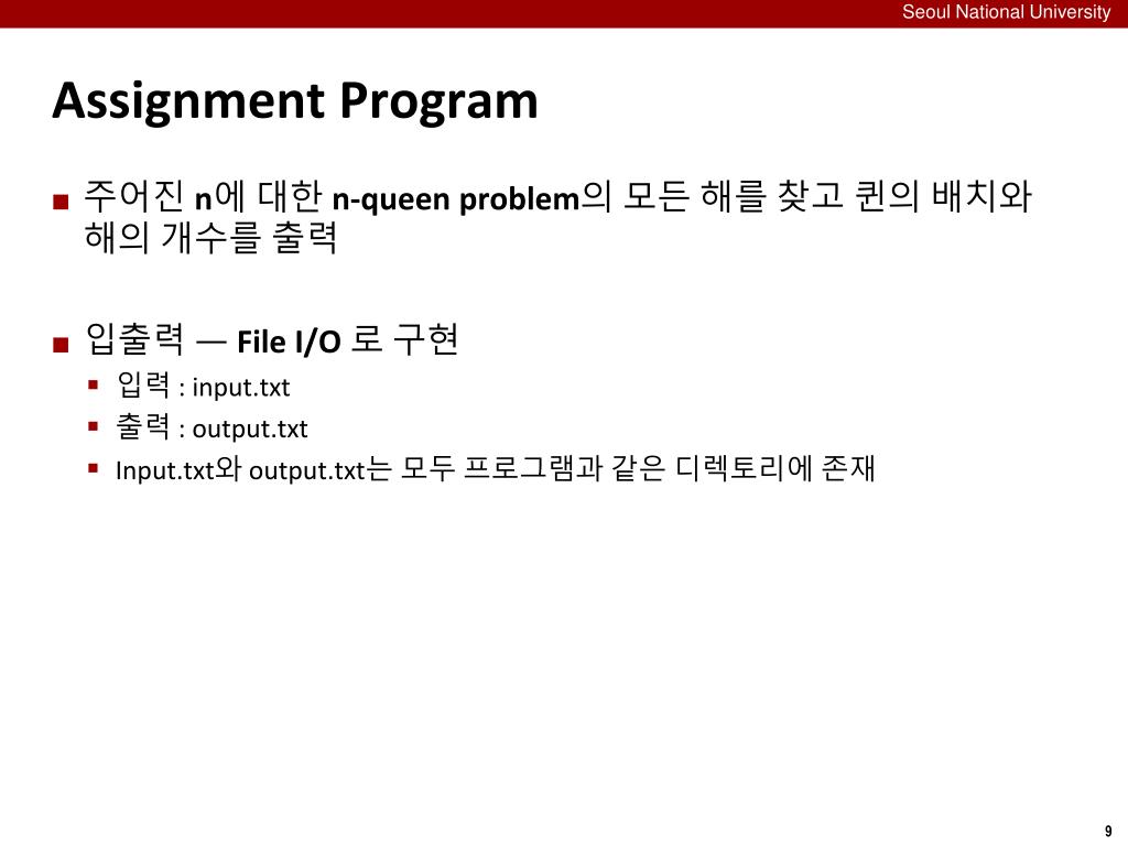 Seoul National University Assignment Program • 주어진 n에 대한 n-queen problem의 모든 해를 찾고 퀸의 배치와 해의 개수를 출력 • 입출력 ㅡFile I/O 로 구현 • 입력 : input.txt • 출력 : output.txt • Input.txt와 output.txt는 모두 프로그램과 같은 디렉토리에 존재