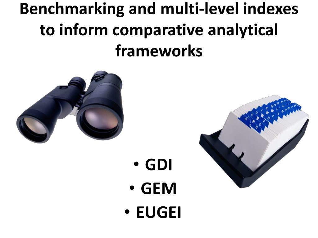 Benchmarking and multi-level indexes to inform comparative analytical frameworks • GDI • GEM • EUGEI
