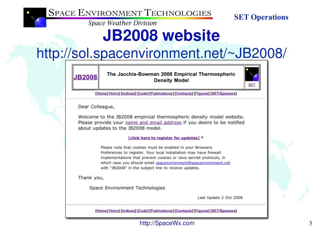 Overview • JB2008 solar indices contributions to nighttime minimum exospheric temperature from daily change relative to 81-day value • S10 (74.1%) - created by SET/APEX from SOHO SEM 26-34 nm bandpass and used with 1-day lag • M10 (10.2%) - created by SET/S2KOPS from NOAA 16/17, SORCE, GOME MgII cwr and used with 2-day lag • F10 (9.8%) - observed by Penticton and used with 1-day lag • Y10 (5.8%) - created by SET/S2KOPS from MgII/Lyman-alpha/GOES XRS and used with 5-day lag • Other solar datasets and models