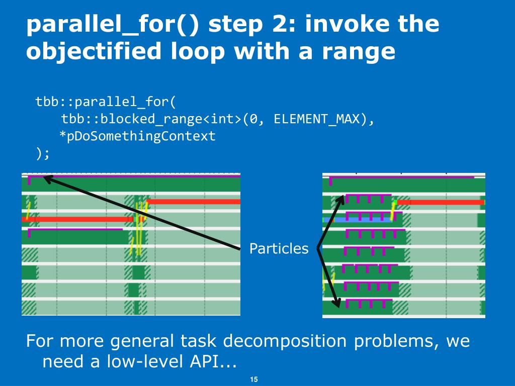 parallel_for() step 2: invoke the objectified loop with a range For more general task decomposition problems, we need a low-level API... tbb::parallel_for( tbb::blocked_range<int>(0, ELEMENT_MAX), *pDoSomethingContext ); Particles