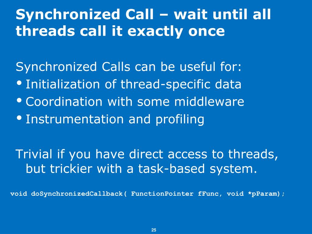Spawn + Wait Root Task Callback Test + Wait Task Task Synchronized Call – wait until all threads call it exactly once Synchronized Calls can be useful for: • Initialization of thread-specific data • Coordination with some middleware • Instrumentation and profiling Trivial if you have direct access to threads, but trickier with a task-based system. void doSynchronizedCallback( FunctionPointer fFunc, void *pParam);