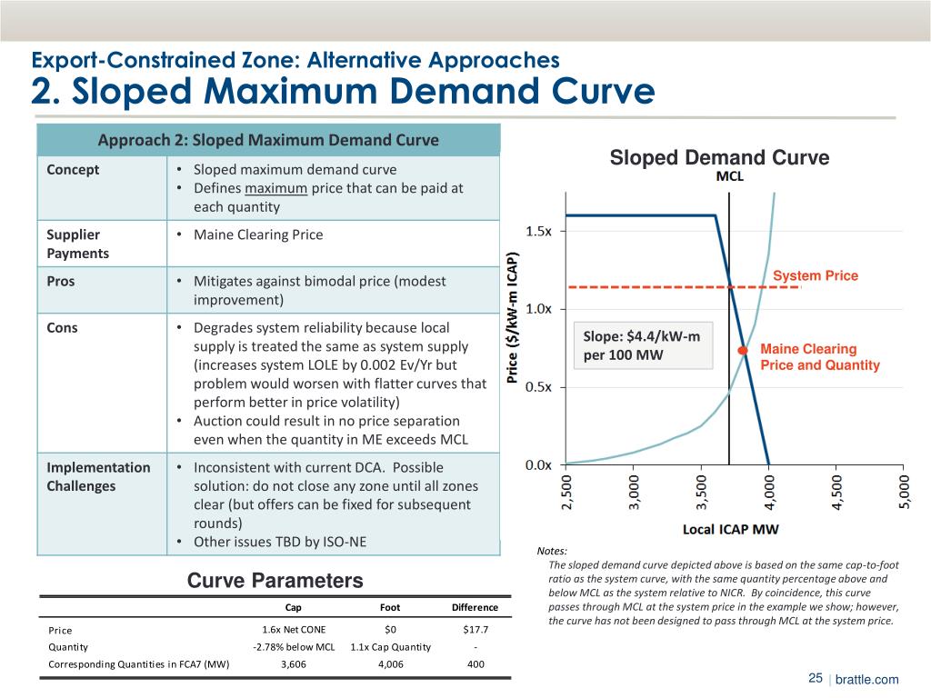 Export-Constrained Zone: Alternative Approaches2. Sloped Maximum Demand Curve Sloped Demand Curve System Price Slope: $4.4/kW-m per 100 MW Maine Clearing Price and Quantity Notes: The sloped demand curve depicted above is based on the same cap-to-foot ratio as the system curve, with the same quantity percentage above and below MCL as the system relative to NICR. By coincidence, this curve passes through MCL at the system price in the example we show; however, the curve has not been designed to pass through MCL at the system price. Curve Parameters