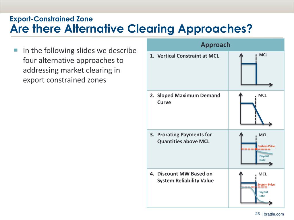 Export-Constrained ZoneAre there Alternative Clearing Approaches? • In the following slides we describe four alternative approaches to addressing market clearing in export constrained zones MCL MCL MCL System Price Payout Rate MCL System Price Payout Rate