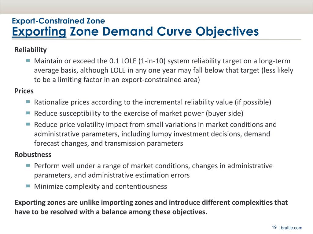 Export-Constrained ZoneExporting Zone Demand Curve Objectives • Reliability • Maintain or exceed the 0.1 LOLE (1-in-10) system reliability target on a long-term average basis, although LOLE in any one year may fall below that target (less likely to be a limiting factor in an export-constrained area) • Prices • Rationalize prices according to the incremental reliability value (if possible) • Reduce susceptibility to the exercise of market power (buyer side) • Reduce price volatility impact from small variations in market conditions and administrative parameters, including lumpy investment decisions, demand forecast changes, and transmission parameters • Robustness • Perform well under a range of market conditions, changes in administrative parameters, and administrative estimation errors • Minimize complexity and contentiousness • Exporting zones are unlike importing zones and introduce different complexities that have to be resolved with a balance among these objectives.