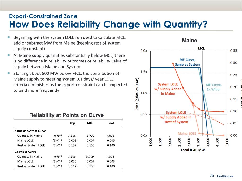 Export-Constrained ZoneHow Does Reliability Change with Quantity? • Beginning with the system LOLE run used to calculate MCL, add or subtract MW from Maine (keeping rest of system supply constant) • At Maine supply quantities substantially below MCL, there is no difference in reliability outcomes or reliability value of supply between Maine and System • Starting about 500 MW below MCL, the contribution of Maine supply to meeting system 0.1 days/ year LOLE criteria diminishes as the export constraint can be expected to bind more frequently Maine Reliability at Points on Curve