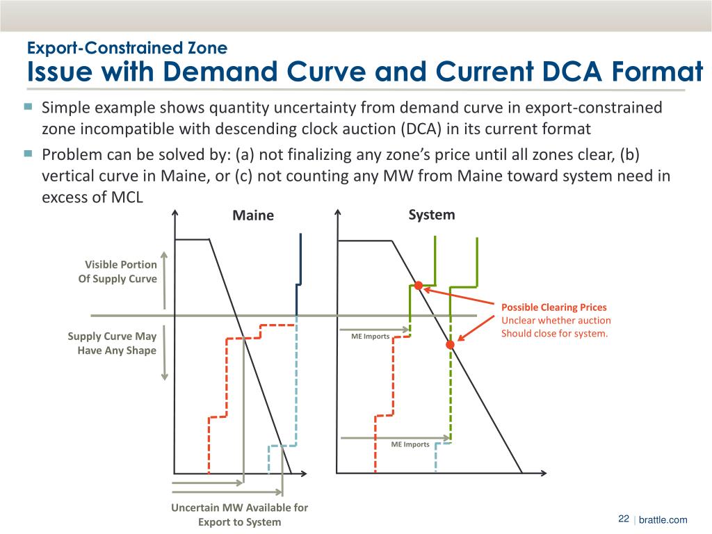 Export-Constrained ZoneIssue with Demand Curve and Current DCA Format • Simple example shows quantity uncertainty from demand curve in export-constrained zone incompatible with descending clock auction (DCA) in its current format • Problem can be solved by: (a) not finalizing any zone’s price until all zones clear, (b) vertical curve in Maine, or (c) not counting any MW from Maine toward system need in excess of MCL System Maine Visible Portion Of Supply Curve Possible Clearing Prices Unclear whether auction Should close for system. Supply Curve May Have Any Shape ME Imports ME Imports Uncertain MW Available for Export to System