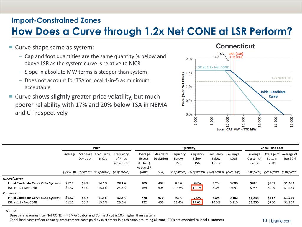 Import-Constrained ZonesHow Does a Curve through 1.2x Net CONE at LSR Perform? Connecticut • Curve shape same as system: • Cap and foot quantities are the same quantity % below and above LSR as the system curve is relative to NICR • Slope in absolute MW terms is steeper than system • Does not account for TSA or local 1-in-5 as minimum acceptable • Curve shows slightly greater price volatility, but much poorer reliability with 17% and 20% below TSA in NEMA and CT respectively Notes: Base case assumes true Net CONE in NEMA/Boston and Connecticut is 10% higher than system. Zonal load costs reflect capacity procurement costs paid by customers in each zone, assuming all zonal CTRs are awarded to local customers.