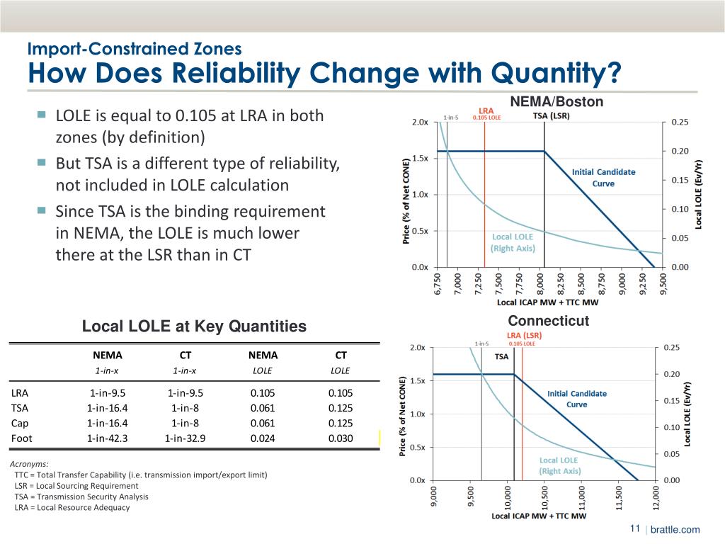 Import-Constrained ZonesHow Does Reliability Change with Quantity? NEMA/Boston • LOLE is equal to 0.105 at LRA in both zones (by definition) • But TSA is a different type of reliability, not included in LOLE calculation • Since TSA is the binding requirement in NEMA, the LOLE is much lower there at the LSR than in CT Connecticut Local LOLE at Key Quantities Acronyms: TTC = Total Transfer Capability (i.e. transmission import/export limit) LSR = Local Sourcing Requirement TSA = Transmission Security Analysis LRA = Local Resource Adequacy