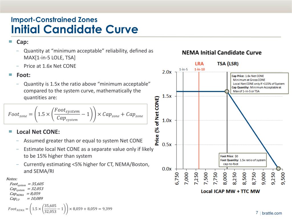 Import-Constrained ZonesInitial Candidate: Parameter Values by Zone Connecticut NEMA Notes: MWquantities based on FCA7; prices based on a Net CONE of $11.1/kW-m. Foot quantity based on the system demand curve foot-to-cap ratio of 1.1. TTC values were 2,600 MW CT, 4,850 MW NEMA in FCA& from http://iso-ne.com/markets/othrmkts_data/fcm/doc/summary_of_icr_values%20expanded.xls