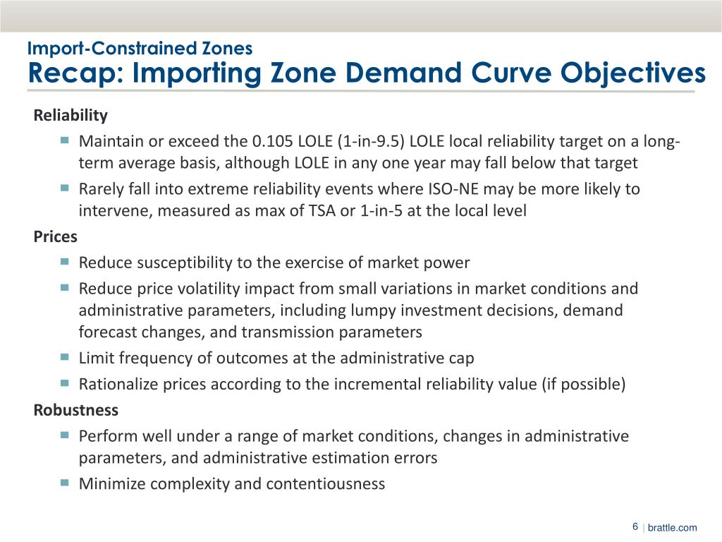 Import-Constrained ZonesRecap: Importing Zone Demand Curve Objectives • Reliability • Maintain or exceed the 0.105 LOLE (1-in-9.5) LOLE local reliability target on a long-term average basis, although LOLE in any one year may fall below that target • Rarely fall into extreme reliability events where ISO-NE may be more likely to intervene, measured as max of TSA or 1-in-5 at the local level • Prices • Reduce susceptibility to the exercise of market power • Reduce price volatility impact from small variations in market conditions and administrative parameters, including lumpy investment decisions, demand forecast changes, and transmission parameters • Limit frequency of outcomes at the administrative cap • Rationalize prices according to the incremental reliability value (if possible) • Robustness • Perform well under a range of market conditions, changes in administrative parameters, and administrative estimation errors • Minimize complexity and contentiousness