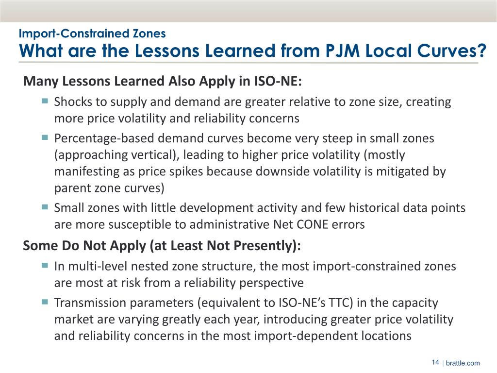 Import-Constrained ZonesWhat are the Lessons Learned from PJM Local Curves? • Many Lessons Learned Also Apply in ISO-NE: • Shocks to supply and demand are greater relative to zone size, creating more price volatility and reliability concerns • Percentage-based demand curves become very steep in small zones (approaching vertical), leading to higher price volatility (mostly manifesting as price spikes because downside volatility is mitigated by parent zone curves) • Small zones with little development activity and few historical data points are more susceptible to administrative Net CONE errors • Some Do Not Apply (at Least Not Presently): • In multi-level nested zone structure, the most import-constrained zones are most at risk from a reliability perspective • Transmission parameters (equivalent to ISO-NE’s TTC) in the capacity market are varying greatly each year, introducing greater price volatility and reliability concerns in the most import-dependent locations