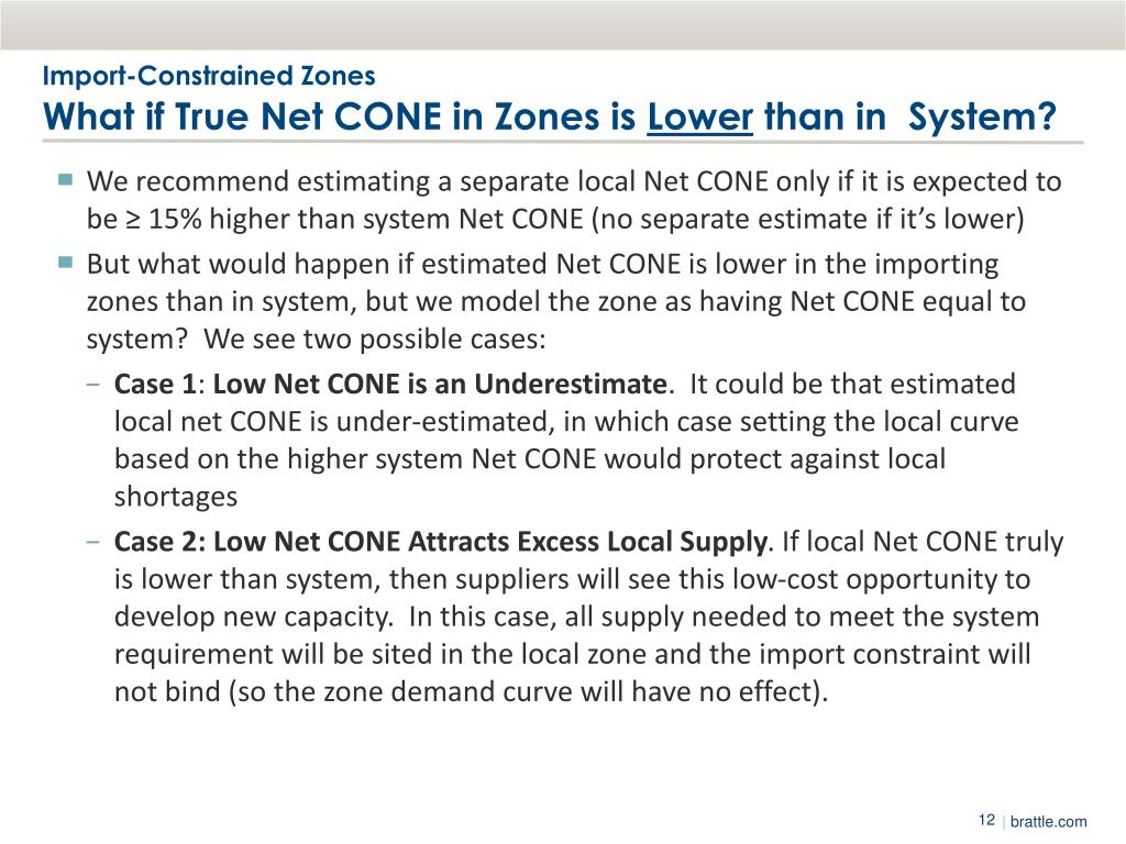 Import-Constrained ZonesWhat if True Net CONE in Zones is Lower than in System? • We recommend estimating a separate local Net CONE only if it is expected to be ≥ 15% higher than system Net CONE (no separate estimate if it’s lower) • But what would happen if estimated Net CONE is lower in the importing zones than in system, but we model the zone as having Net CONE equal to system? We see two possible cases: • Case 1: Low Net CONE is an Underestimate. It could be that estimated local net CONE is under-estimated, in which case setting the local curve based on the higher system Net CONE would protect against local shortages • Case 2: Low Net CONE Attracts Excess Local Supply. If local Net CONE truly is lower than system, then suppliers will see this low-cost opportunity to develop new capacity. In this case, all supply needed to meet the system requirement will be sited in the local zone and the import constraint will not bind (so the zone demand curve will have no effect).