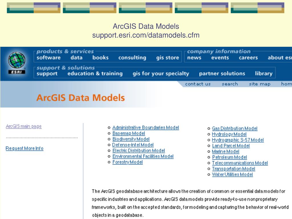 Purpose of ArcHydro, ArcMarine etc. • Basic template for implementing GIS projects • input, formatting, geoprocessing, creating maps, performing analyses • Basic framework for writing program code and maintaining applications • development of tools for the community • Promote networking and data sharing through established standards • common model=interoperability