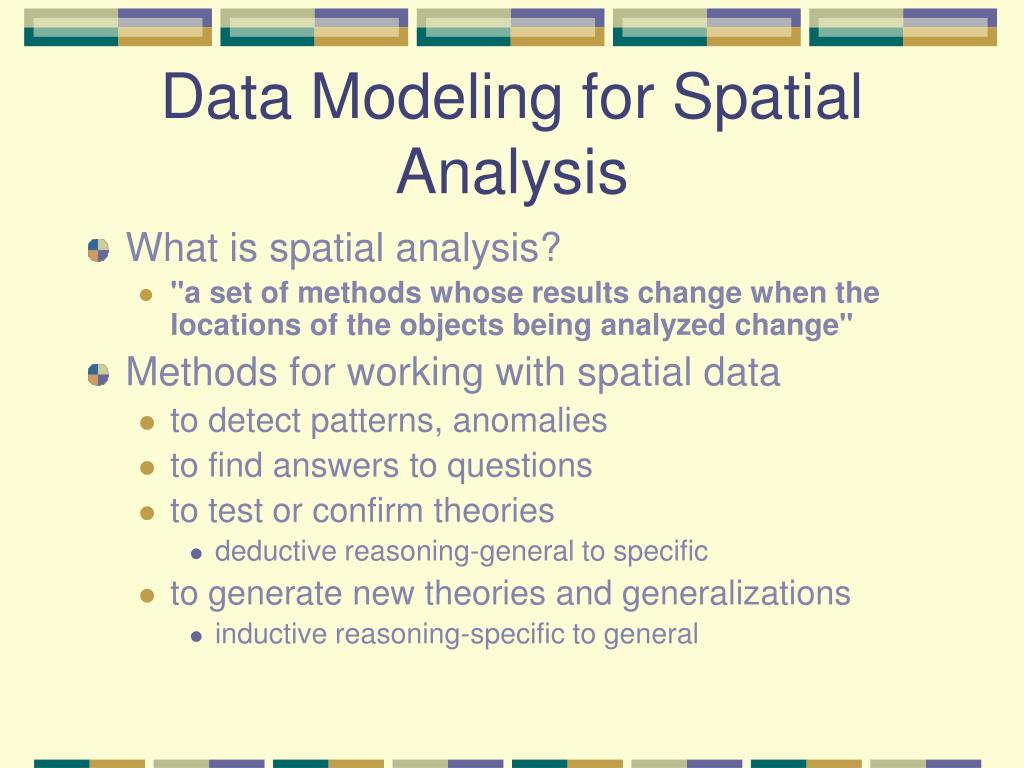 Data Modeling for Spatial Analysis • What is spatial analysis? • "a set of methods whose results change when the locations of the objects being analyzed change" • Methods for working with spatial data • to detect patterns, anomalies • to find answers to questions • to test or confirm theories • deductive reasoning-general to specific • to generate new theories and generalizations • inductive reasoning-specific to general